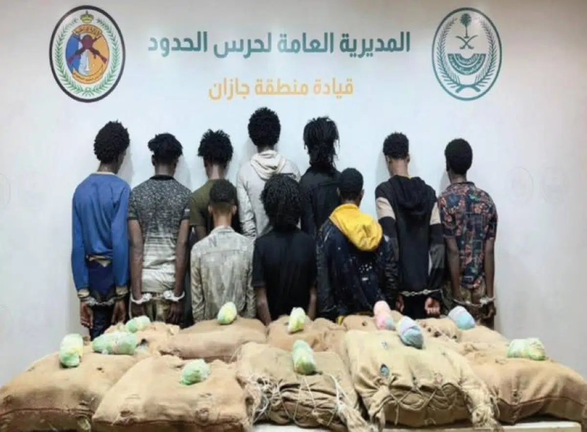 تمكنت الدوريات البرية لحرس الحدود في قطاع الدائر بمنطقة جازان من القبض على 10 مخالفين لنظام أمن الحدود، جميعهم من الجنسية الإثيوبية. وقد تم ضبطهم أثناء محاولتهم تهريب 200 كيلوغرام من نبات القات المخدر.