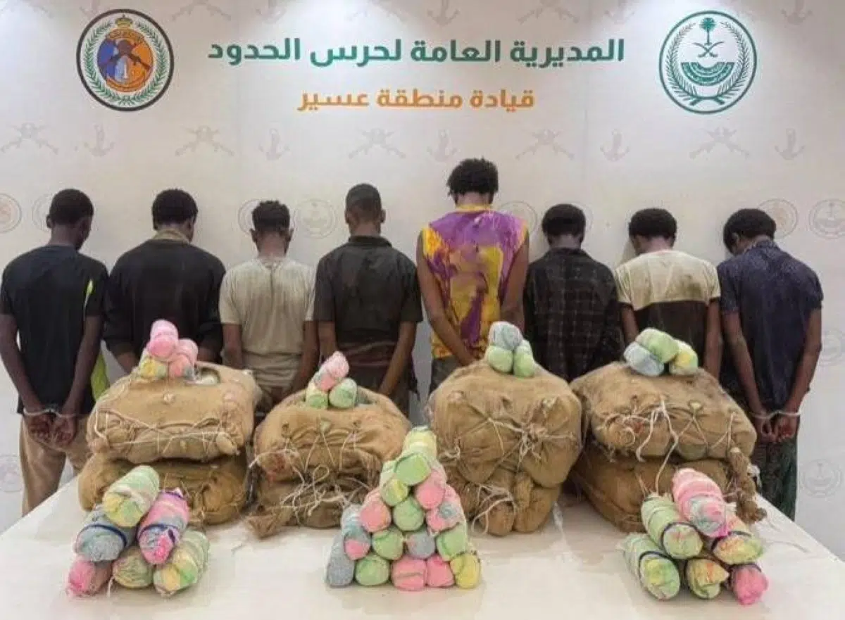 حرس الحدود بعسير يضبط 8 مهربين إثيوبيين بحوزتهم 160 كجم من القات المخدر، تعرف على تفاصيل العملية ودعوة للإبلاغ عن التهريب.