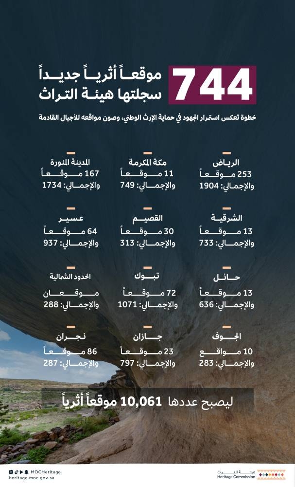 أعلنت هيئة التراث تسجيل 744 موقعًا أثريًا جديدًا في سجل الآثار الوطني، مما يرفع حصيلة المواقع الأثرية المسجلة إلى