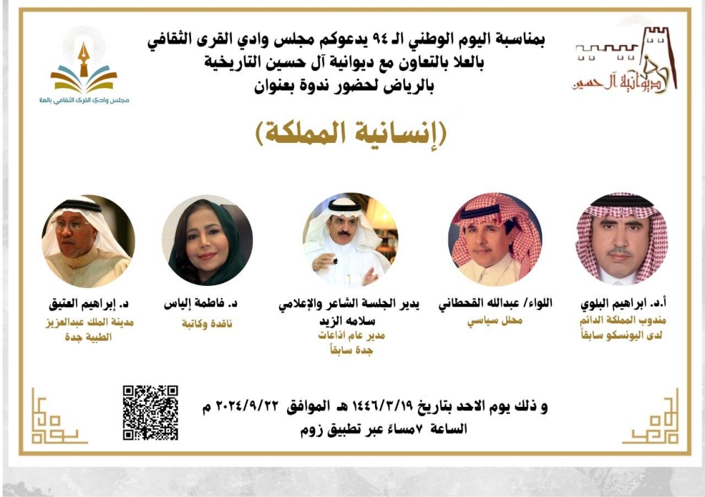 ضمن الاحتفاء باليوم الوطني الـ94 للمملكة العربية السعودية، عقد مجلس وادي القرى الثقافي بالعلا، بالتعاون مع ديوانية الحسين التاريخية بالرياض ندوة ثقافية بعنوان «إنسانية المملكة»، يوم الأحد 19/3/1446هـ الموافق 22/9/2024 في تمام الساعة السابعة مساء عبر تطبيق «زوم».