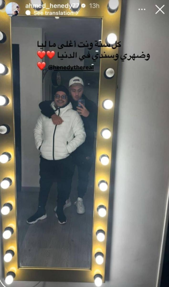 كما علّق على صورته الثانية مع والده أمام المرآة فكتب: «كل سنة وأنت أغلى ما ليا وظهري وسندي في الدنيا».