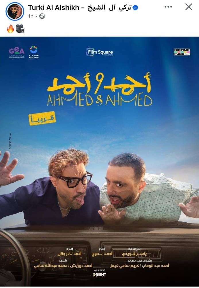 كشف رئيس الهيئة العامة للترفيه المستشار تركي آل الشيخ، عن البوستر الرسمي لفيلم «أحمد وأحمد»، بطولة النجمين المصريين