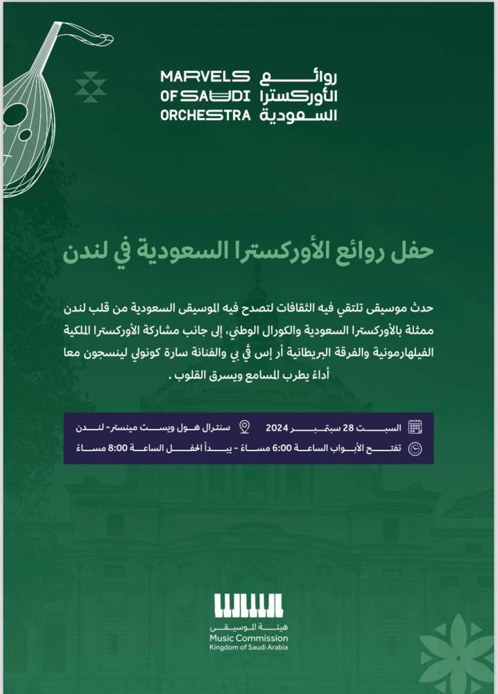 برعاية وزير الثقافة الأمير بدر بن عبدالله بن فرحان، تنظم هيئة الموسيقى حفل «روائع الأوركسترا السعودية» اليوم (السبت)، وذلك في مسرح سنترل هول وستمنستر في قلب العاصمة البريطانية لندن، في إطار جهودها لتعزيز حضور الثقافة والفنون السعودية على الصعيد الدولي.