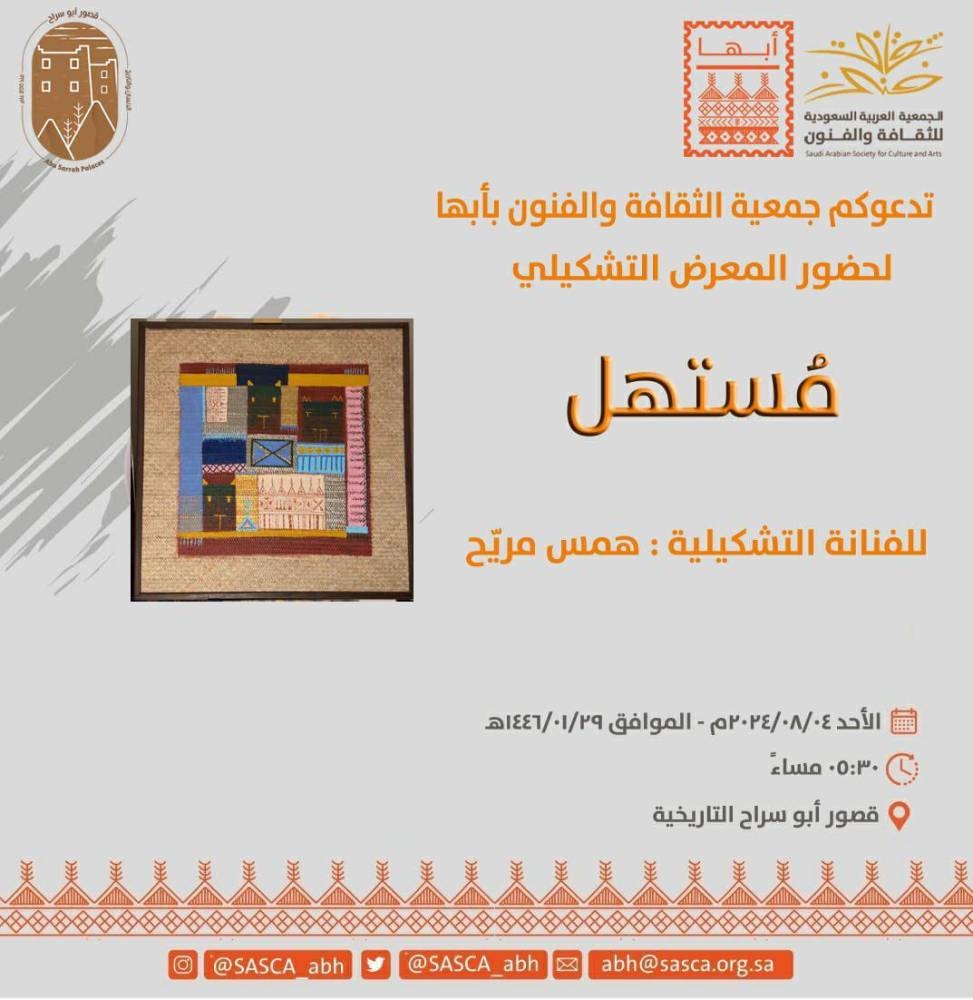 تنظّم جمعية الثقافة والفنون بأبها، مساء غدٍ (الأحد) عند الساعة الـ 5:30، معرض «مُستهل» للفنانة التشكيلية همس مريّح، في قصور أبو سراح التاريخية.