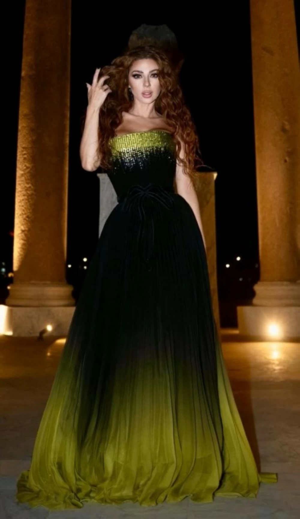 The opening ceremony of the National Museum in Sharm El Sheikh witnessed two prominent appearances by Myriam Fares, the first in a fluorescent green dress and the second in a black and green mix. The green dress caught attention with its vibrant color and design that highlighted her body shape, giving a strong presence suitable for the celebratory event, but the fluorescent color poses a risk if the fabric and finishing are not of high luxury.