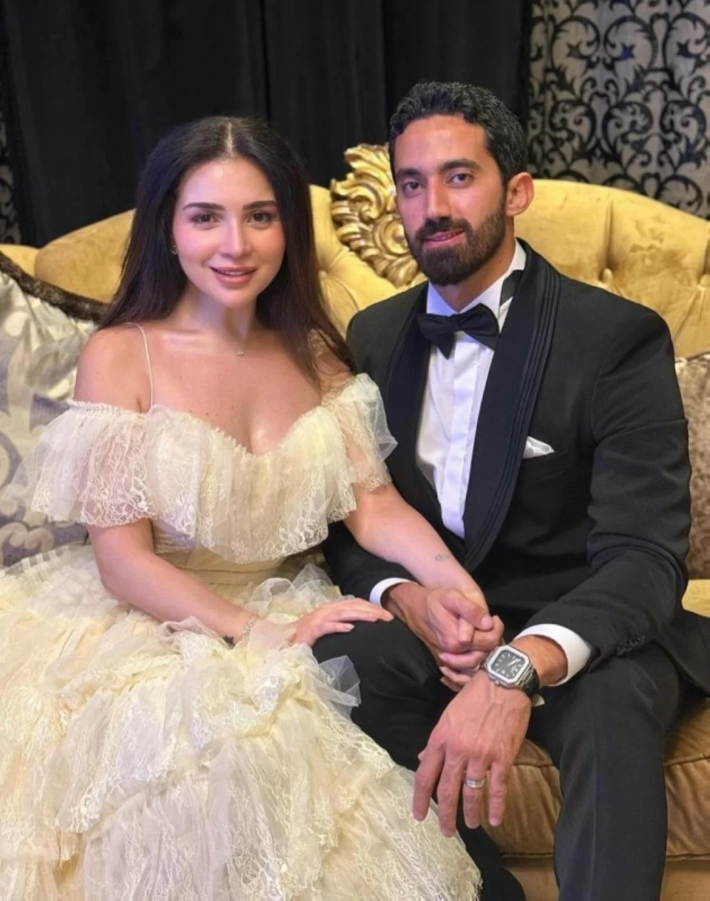 Mai Ezz El-Din stood out at her engagement party with a soft and simple look, choosing an ivory dress with a calm romantic design that reflects her classic taste for light colors and luxurious fabrics.