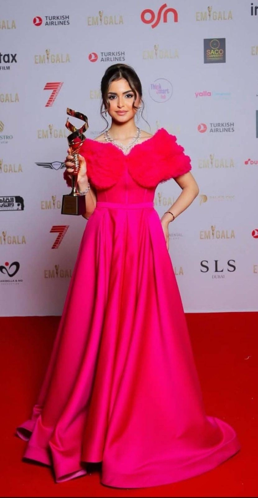 • حلا الترك: ظهرت بفستان فوشيا من تصميم دار AAVVA، بتصميم أوف شولدر مزين بكشاكش من الفرو عند الأكتاف، مع تنورة واسعة ومجوهرات فضية ناعمة.