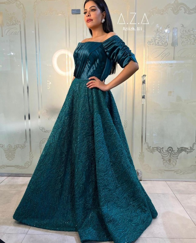 امتدّ الفستان إلى ذيل ملون بلمسة دراماتيكية تُكمل الإطلالة الضخمة بفضل الطول والانسيابية، مما جعله مثالياً للأجواء الاحتفالية الكبرى.