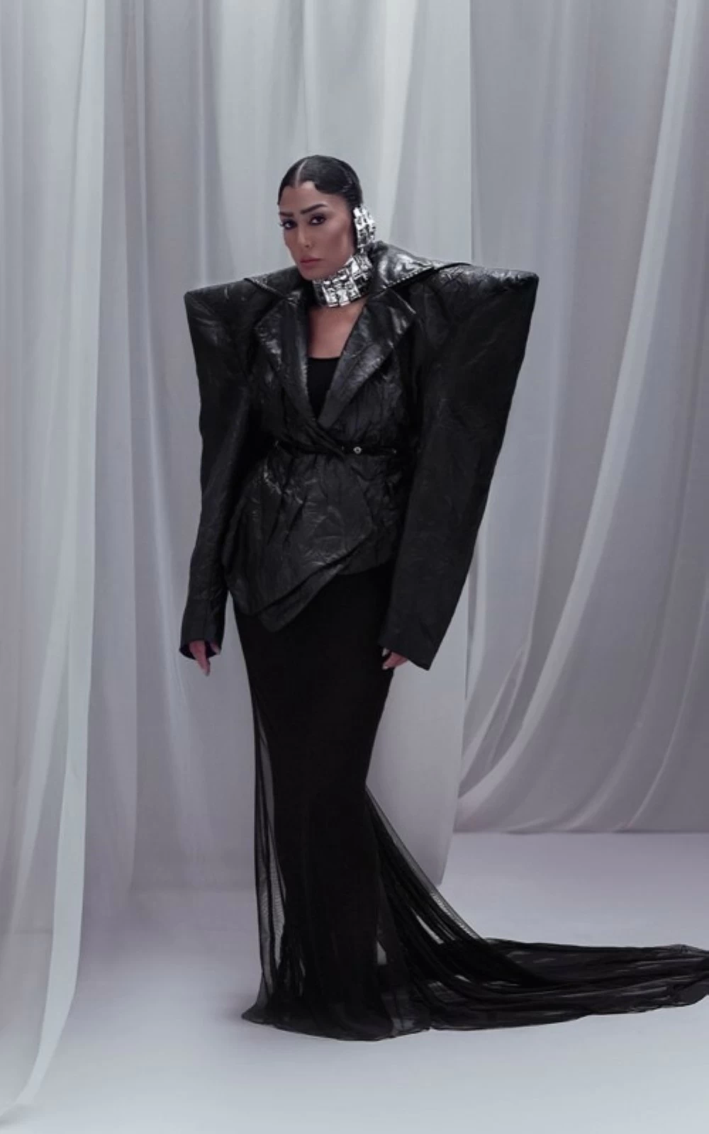 غادة عبد الرازق ظهرت في أحدث جلسة تصوير بإطلالة سوداء غريبة وغير تقليدية ارتدت ثوبا أسود مع جاكيت جلد بأكتاف كبيرة وتنورة ضيقة وطويلة ذات جزء شفاف. وأضفت إكسسوارات فضية بارزة وتسريحة شعر مبلل مع مكياج قوي لإبراز الحدة والجرأة.