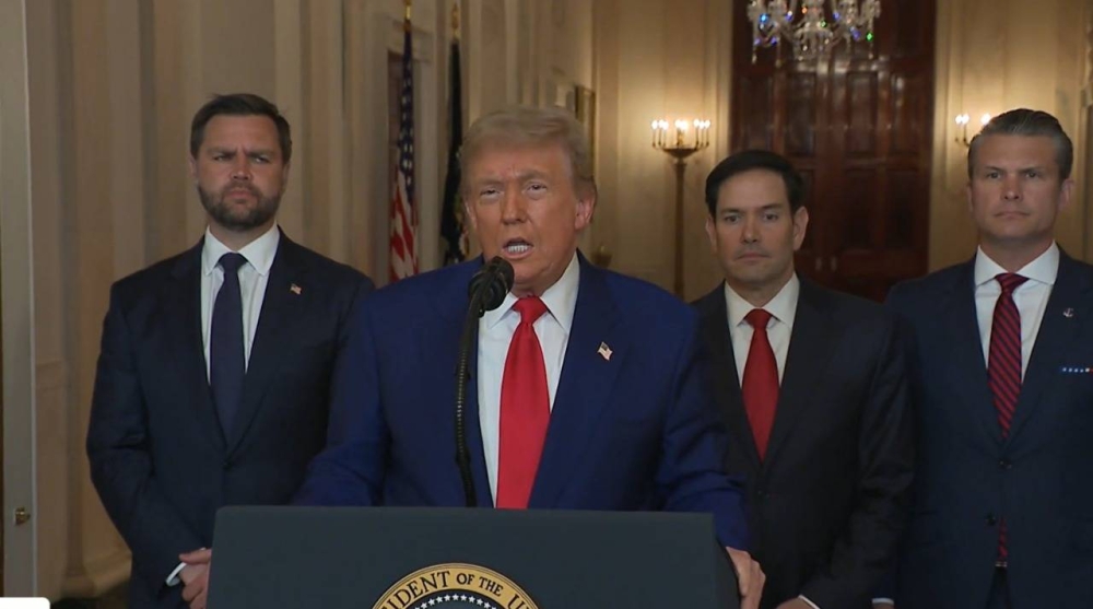 أكد الرئيس الأمريكي دونالد ترمب، في خطابه من البيت الأبيض، في أعقاب الهجوم الأمريكي على إيران، أن البرنامج النووي الإيراني انتهى، مبيناً أن الجيش الأمريكي نفذ «ضربات دقيقة وشاملة» على مواقع فوردو ونطنز وأصفهان النووية الإيرانية.