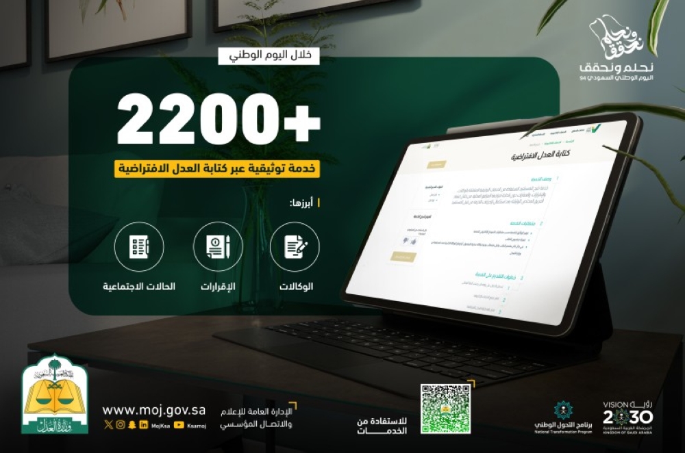 وزارة العدل: 2,200 خدمة توثيقية عبر كتابة العدل الافتراضية خلال اليوم الوطني