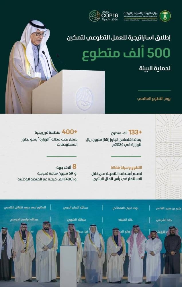 أكد وزير البيئة والمياه والزراعة رئيس الدورة الـ (16) لمؤتمر الأطراف لاتفاقية الأمم المتحدة لمكافحة التصحر المهندس عبدالرحمن بن عبدالمحسن الفضلي دعم الجهود الوطنية لتحقيق أهداف التنمية المستدامة، وتعزيز العمل التطوعي البيئي، من خلال إطلاق إستراتيجية شاملة للعمل التطوعي، بدءًا من 2025؛ لتمكين 500 ألف متطوع، عبر عدة ركائز أساسية تشمل تعزيز الوعي البيئي، وتنظيم الجهود التطوعية، وتوفير الأدوات والفرص للمتطوعين، وتحفيزهم؛ لترسيخ الثقافة التطوعية المستدامة للإسهام في حماية البيئة.