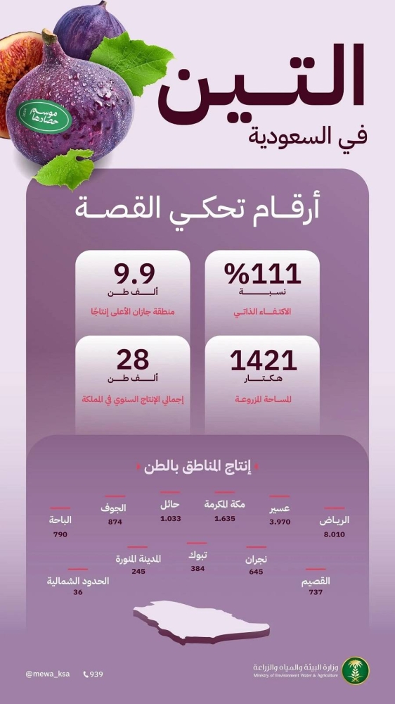 أكدت وزارة البيئة والمياه والزراعة أن المملكة تحقق الاكتفاء الذاتي من فاكهة التين بنسبة (111%)، وبكميات إنتاج سنوي تتجاوز (28) ألف طن في مساحة مزروعة تبلغ نحو (1421) هكتارا في مختلف مناطق المملكة.