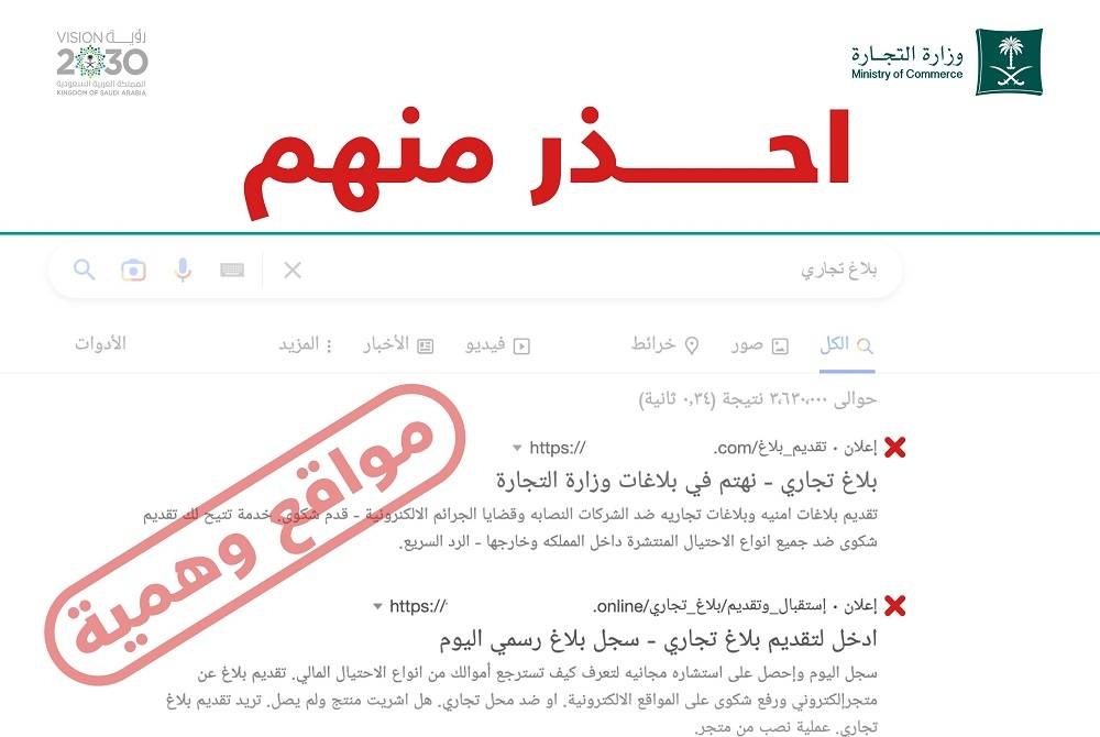 حذّرت وزارة التجارة من مواقع وهمية وأشخاص ينتحلون صفة الوزارة، مستغلين محركات البحث ويدّعون من خلالها استقبال بلاغات المستهلكين.