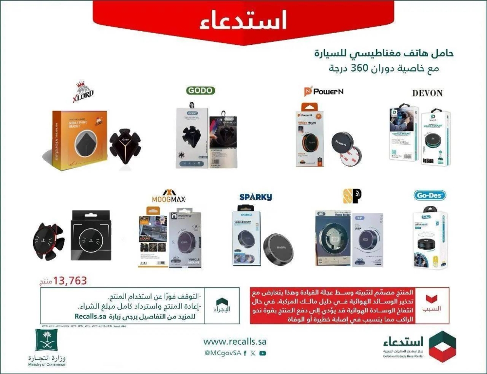 أعلنت وزارة التجارة عن استدعاء 13,763 حامل هاتف مغناطيسي للسيارة بخاصية دوران 360 درجة، بسبب أن هذه المنتجات مصمّمة
