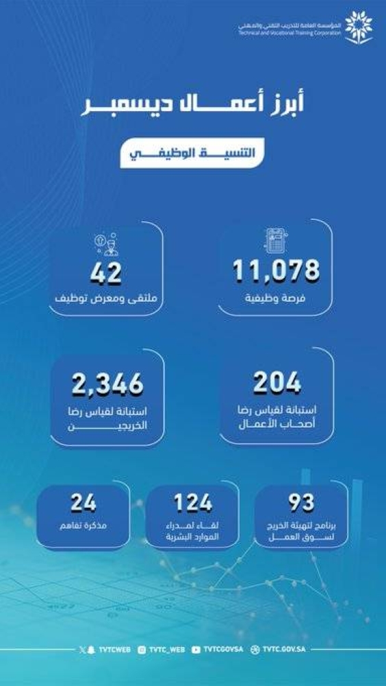 يذكر أن المؤسسة العامة للتدريب التقني والمهني تنفذ الاختبارات للمتدربين والمتدربات بالمعاهد والمراكز التدريبية الأهلية وذلك بهدف تقييم مخرجات البرامج التدريبية، وبلغ عدد المختبرين في الاختبارين الشامل والتأهيلي في ديسمبر الماضي 10620 مدربا ومتدربة.