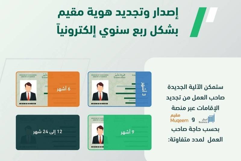 وكشفت أن هذه الآلية ستمكن صاحب العمل من تجديد الإقامات بحسب حاجته لمدد متفاوتة، إما لـ3 أشهر، أو 6 أشهر أو 9 أشهر أو لفترة من 12 – 24 شهرا.