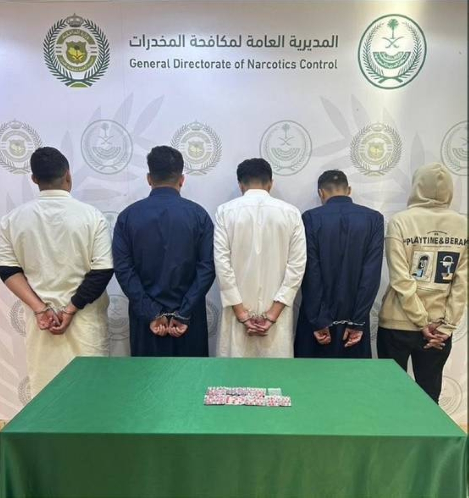 قبضت المديرية العامة لمكافحة المخدرات على (5) مواطنين بمنطقة الحدود الشمالية لترويجهم مادة الحشيش المخدر وأقراصاً