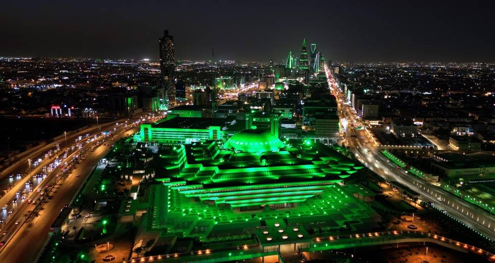 اكتسى مبنى وزارة الداخلية في الرياض، الذي يعد من أبرز معالم العاصمة لما يتميز به من تصميم هندسي جذاب ومميز، باللون