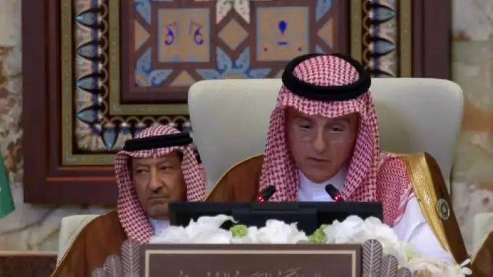 وقال الجبير في كلمة السعودية أمام القمة العربية الـ34 في بغداد، إن «الظروف الاستثنائية التي تمر بها القضية الفلسطينية تتطلب مواصلة جهودنا المشتركة لرفع المعاناة الإنسانية التي يتعرض لها الشعب الفلسطيني الشقيق، ووقف الجرائم والانتهاكات، التي ترتكبها سلطات الاحتلال الإسرائيلية وتمثل انتهاكاً صارخاً لميثاق الأمم المتحدة والقوانين والقرارات والأعراف الدولية».