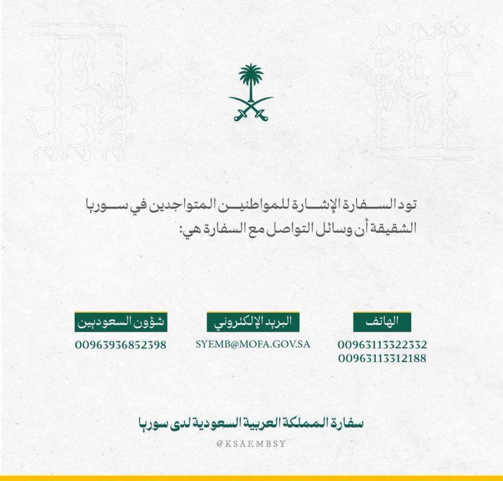 نشرت سفارة السعودية في دمشق أرقام اتصال؛ للتواصل معها من قبل المواطنين السعوديين الموجودين في سورية.