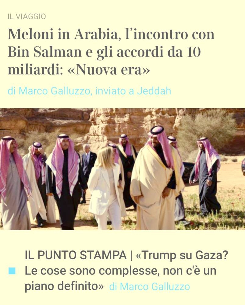 وأشارت الصحيفة، إلى أن اجتماع ميلوني، مع ولي العهد السعودي، تناول جميع النقاط الرئيسية في جدول أعمال معقد، بما في ذلك إعادة إعمار غزة، واستقرار سورية، والبحث عن سلام دائم في أوكرانيا، إضافة إلى التوافقات المحتملة بين خطة ماتي لأفريقيا والقوة المالية للمملكة العربية السعودية.