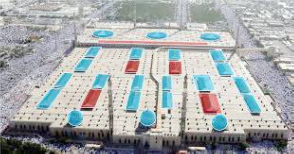 والثاني: إضافة وحدات لتكييف ومعالجة الهواء تقوم بضخ هواء نقي من خارج المسجد «دون إعادة تدوير الهواء الراجع من داخل المسجد»، وذلك للمحافظة على نسبة الأكسجين المطلوبة مع زيادة كفاءة التبريد للمسجدين بقدرة تبريدية تتجاوز 3650 طناً تبريدياً، وتدعيمه بنظام طرد ميكانيكي للهواء لكي يتم تأمين دخول الهواء النقي.