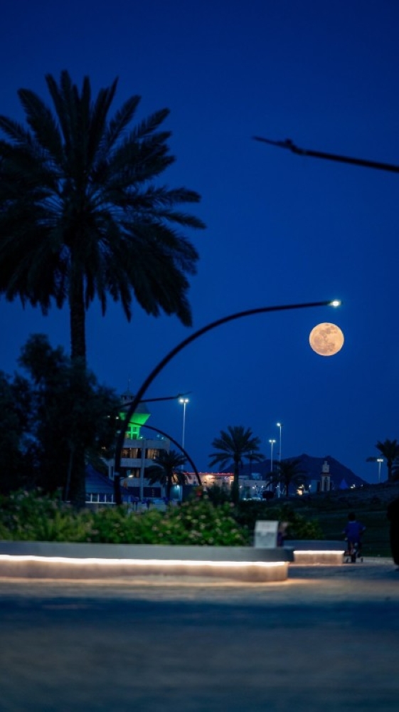 في الصور الملتقطة من قلب المدينة، بدا المشهد كلوحةٍ لا تُرسم إلا مرةً في العمر، فالقمر كان مكتملاً، ناصعاً، يتدلّى من السماء وكأنه أبطأ سيره احتراماً لمدينة تعرف كيف تصمت بوقار وتبهر بلا صخب.