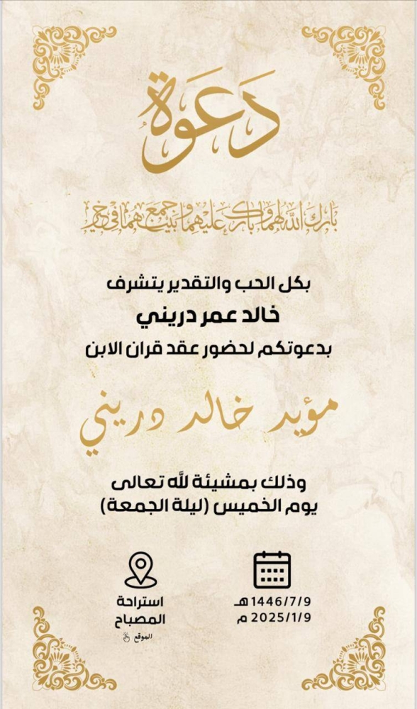 يحتفل اليوم (الخميس)، إمام وخطيب مسجد البراء بن عازب بحي المرجان الشيخ خالد عمر دريني بجدة، بعقد قران ابنه الشاب