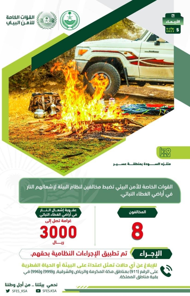وأوضحت القوات الخاصة للأمن البيئي أنه تم تطبيق الإجراءات النظامية بحقهم، مؤكدةً أن عقوبة إشعال النار أو استعمالها في المناطق المحمية غرامة تصل إلى 20,000 ريال، وفي أراضي الغطاء النباتي غرامة تصل إلى 3000 ريال.