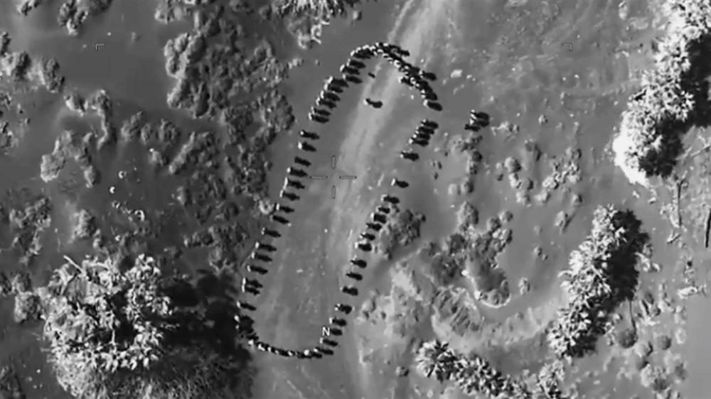 وفي الفيديو الذي عرضه ترمب أظهر عشرات المسلحين يشكلون دائرة واسعة وترصدهم الطائرة من الأعلى ليتم استهدافهم والقضاء عليهم بالكامل مع عدد من الآليات التي كانت على مقربة منهم.