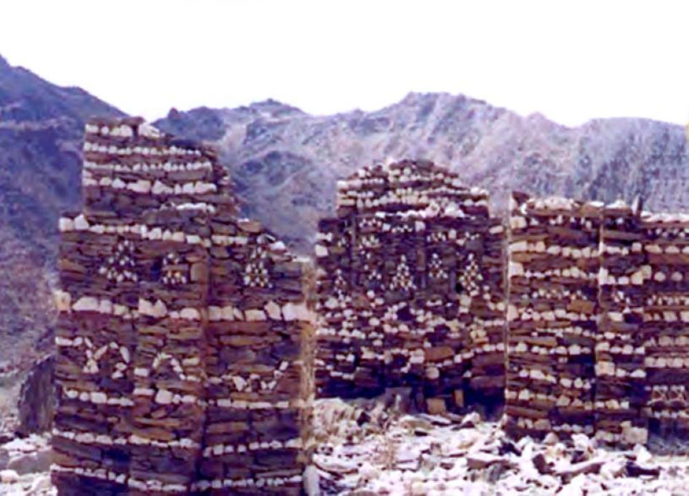 ويُضيف: بُنيت هذه المقابر بالحجارة المزخرفة بالمرو بعدّة أشكال وهي بحد ذاتها تُمثّل فناً معمارياً فريداً من نوعه، يدل على التقدّم والتميّز الحضاري لسكان هذا الوادي، فهذه الحضارة جديرة بالبحث والدراسة ويتكون البناء الواحد من عدة قبور، الواحد فوق الآخر وقد تتكوّن بعض الأبنية من دورين وبعضها من ثلاثة وأربعة، وقد زُيّنت هذه الأبنية من الخارج بأشكال هندسية متعددة على شكل مثلث أو بعض الأشكال الهندسية الأخرى باستخدام حجر المرو الأبيض كنوع من الزخرفة.