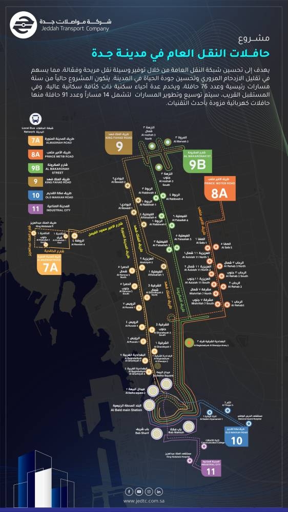 كشفت إمارة منطقة مكة المكرمة أن مشروع حافلات النقل العام في جدة يتكون حالياً من 6 مسارات رئيسية و76 حافلة، ويخدم