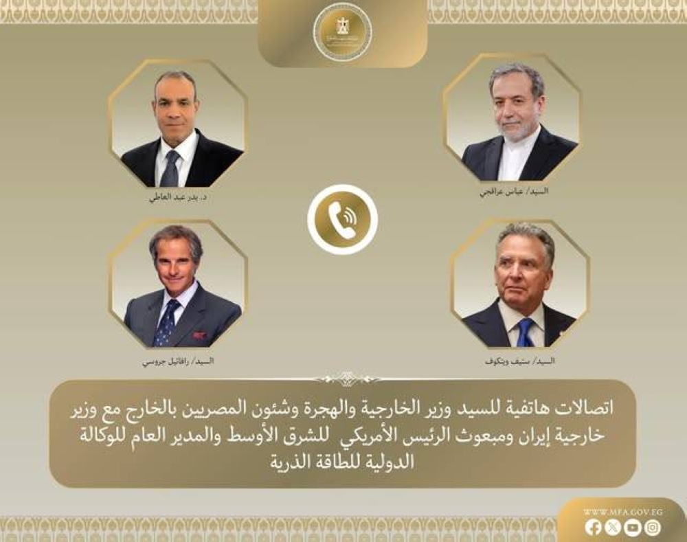 أجرى وزير الخارجية والهجرة المصري الدكتور بدر عبدالعاطي، اليوم (الأربعاء)، سلسلة من الاتصالات الهاتفية شملت كلًا من وزير الخارجية الإيراني عباس عراقجي، وستيف ويتكوف، مبعوث الرئيس الأمريكي الخاص للشرق الأوسط، ورافائيل غروسي، المدير العام للوكالة الدولية للطاقة الذرية.