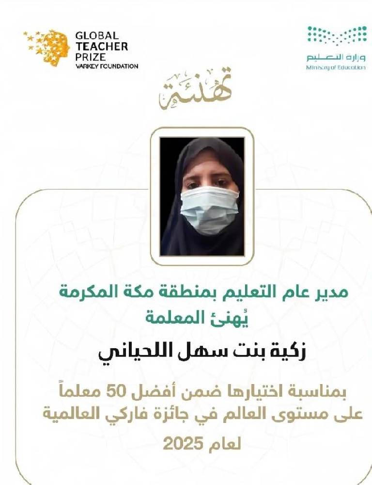 حصدت المعلمة زكية سهل اللحياني من إدارة التعليم بمنطقة مكة المكرمة جائزة «فاركي» العالمية، ضمن أفضل 50 معلماً متميزاً على مستوى العالم للعام 2025.