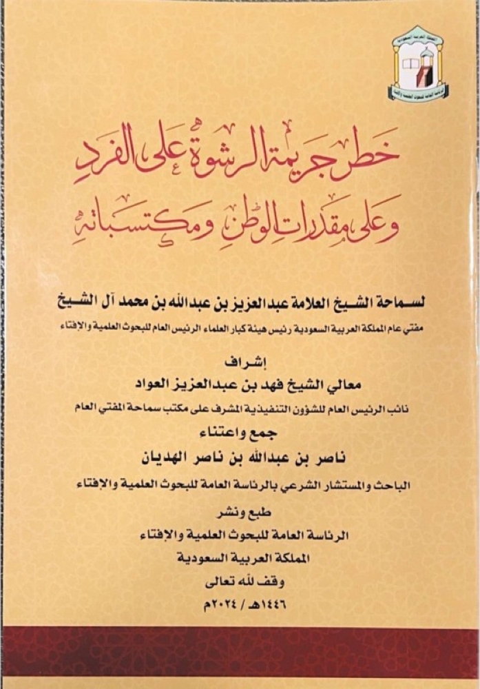 في إطار الجهود المتواصلة التي تبذلها السعودية لمواكبة تطلعات القيادة الرشيدة في مكافحة الفساد وتعزيز الوعي المجتمعي بخطره، أصدرت الرئاسة العامة للبحوث العلمية والإفتاء كتاباً جديداً بعنوان: «خطر جريمة الرشوة على الفرد وعلى مقدرات الوطن ومكتسباته» من تأليف مفتي عام المملكة، رئيس هيئة كبار العلماء، الرئيس العام للبحوث العلمية والإفتاء الشيخ عبدالعزيز بن عبدالله بن محمد آل الشيخ.
