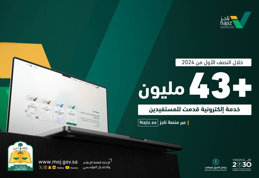 قدمت وزارة العدل أكثر من 43 مليون خدمة عبر منصة ناجز Najiz.sa، خلال النصف الأول من العام الحالي 2024، دون الحاجة إلى زيارة