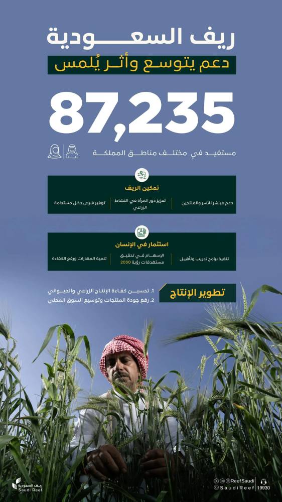 كشف برنامج التنمية الريفية الزراعية المستدامة «ريف السعودية» بلوغ عدد المستفيدين من دعمه إلى 87,235 مستفيدًا في
