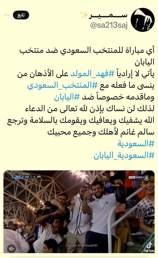 • «لن ننسى من فرّحنا بالتأهل السعودي ومن نفس ملعب الجوهرة في لقاء السعودية اليابان، الله يفرحنا بشفائك يا فهد المولد، لن ننساك بإذن الله تعالى من الدعاء.. الله يشفيك ويعافيك ويقومك بالسلامة وترجع سالماً غانماً لأهلك وجميع محبيك».