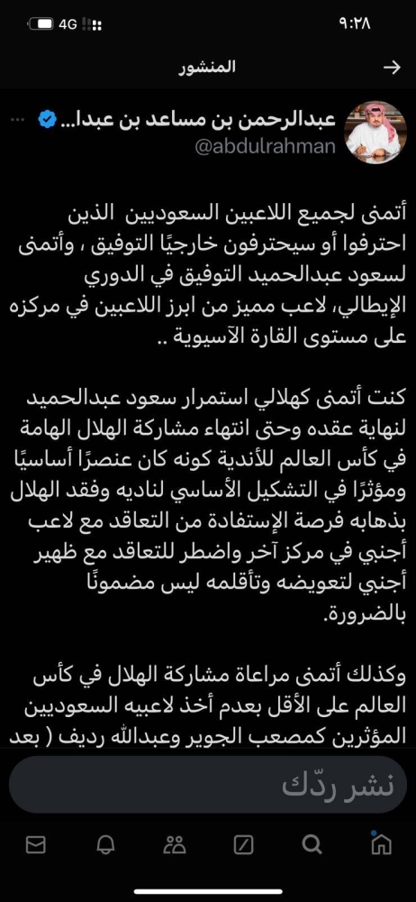 علق الأمير عبد الرحمن بن مساعد، رئيس نادي الهلال سابقاً وعضو الشرف، عبر حسابه الشخصي في منصة إكس، على احتراف لاعب الهلال سابقاً سعود عبدالحميد، مع فريق روما الإيطالي، وكتب: «أتمنى لجميع اللاعبين السعوديين الذين احترفوا أو سيحترفون خارجيًا التوفيق، وأتمنى لسعود عبدالحميد التوفيق في الدوري الإيطالي، لاعب مميز من أبرز اللاعبين في مركزه على مستوى القارة الآسيوية»، وأضاف: «كنت أتمنى كهلالي استمرار سعود عبدالحميد لنهاية عقده وحتى انتهاء مشاركة الهلال الهامة في كأس العالم للأندية كونه كان عنصرًا أساسيًا ومؤثرًا في التشكيل الأساسي لناديه وفقد الهلال بذهابه فرصة الاستفادة من التعاقد مع لاعب أجنبي في مركز آخر واضطر للتعاقد مع ظهير أجنبي لتعويضه وتأقلمه ليس مضمونًا بالضرورة، وكذلك أتمنى مراعاة مشاركة الهلال في كأس العالم على الأقل بعدم أخذ لاعبيه السعوديين المؤثرين كمصعب الجوير وعبدالله رديف (بعد ذهاب سعود قبل نهاية عقده الذي كان سينتهي بعد كأس العالم مباشرة)، كما أنني أتمنى تأجيل احترافهم للموسم القادم بعد انتهاء مشاركة الهلال في كأس العالم فالهلال يحتاح تقوية صفوفه لا إضعافها، فمع غياب سعود وذهاب ميشيل ليحل محله نيمار غير الجاهز ضعفت الجهة اليمنى للهلال بشكل واضح، وبغياب نيمار الذي قد يطول حتى اكتمال جاهزيته وحتى لو اكتملت فنيمار رغم أنه لاعب من كبار لاعبي العالم إلا أنه عرضة للإصابات المتكررة في آخر أربعة مواسم له، لذلك الهلال يحتاج لتقوية صفوفه للمشاركة في كأس العالم في نهاية هذا الموسم وما يحصل له حاليًا لا يسير في هذا الإتجاه.