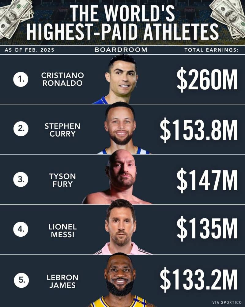 لا يزال نجم كرة القدم البرتغالي كريستيانو رونالدو يتربع على عرش الرياضيين الأعلى أجراً بـ 260 مليون دولار، بفضل عقده الضخم مع نادي النصر السعودي، بالإضافة إلى دخله الكبير من عقود الرعاية والمشاريع التجارية.