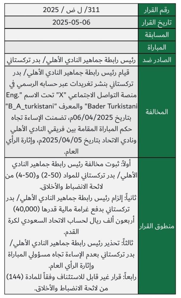 ونصّ القرار على أن رئيس رابطة جماهير النادي الأهلي قام بنشر تغريدات عبر حسابه الرسمي في منصة التواصل الاجتماعي «X» تحت الاسم (Eng. Bader Turkistani) بالمعرّف (@B_A_turkistani) بتاريخ 6/ 4/ 2025، تضمنت الإساءة تجاه حكم المباراة المقامة بين الأهلي والاتحاد بتاريخ 5/ 4/ 2025، وإثارة الرأي العام. كما نص القرار على ثبوت مخالفة رئيس رابطة جماهير النادي الأهلي بدر تركستاني للمواد (50-2) و(450) من لائحة الانضباط والأخلاق، وإلزام تركستاني بدفع غرامة مالية قدرها 40 ألف ريال لحساب الاتحاد السعودي لكرة القدم. وتضمّن القرار تحذير رئيس رابطة جماهير النادي الأهلي بدر تركستاني بعدم الإساءة تجاه مسؤولي المباراة وإثارة الرأي العام.