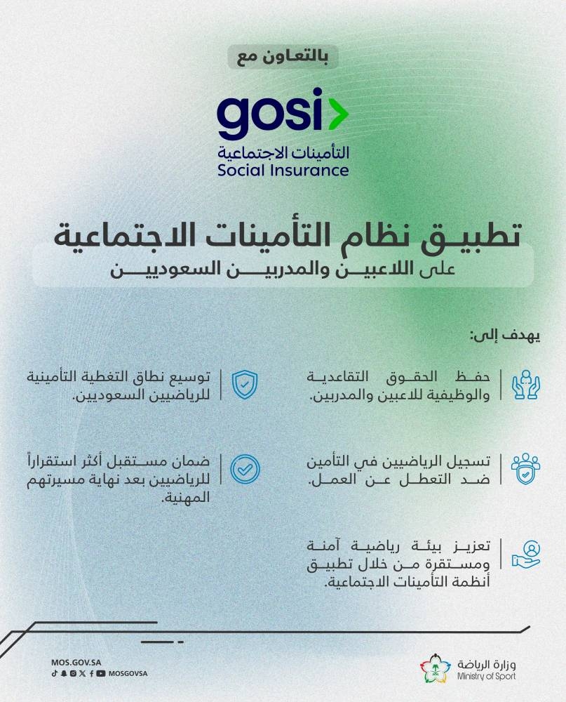 في خطوة إيجابية لتعزيز الجوانب التنظيمية والحوكمة في القطاع الرياضي، الذي يُعد ركيزة في الاقتصاد الوطني، إضافة إلى تمكين منسوبي القطاع الرياضي من فئة اللاعبين والمدربين السعوديين من الاستفادة من أنظمة وتشريعات رسمية تكفل لهم مزيداً من الاستقرار العملي والاجتماعي، أعلنت وزارة الرياضة والمؤسسة العامة للتأمينات الاجتماعية البدء بتطبيق نظام التأمينات الاجتماعية على اللاعبين والمدربين السعوديين اعتباراً من الثلاثاء القادم الموافق 1 يوليو 2025.