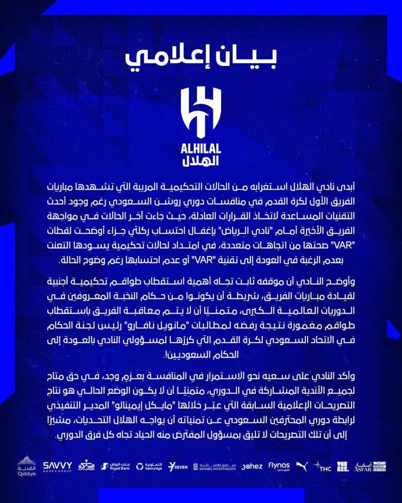 بعد 60 دقيقة من تصريحات المدرب البرتغالي «جورجي جيسوس»، النارية ضد الطاقم التحكيمي السلفادوري الذي أدار مباراة فريقه أمام الرياض، والتي تعادل فيها الهلال بهدف لمثله في اللقاء الذي جمعهما على ملعب المملكة أرينا في الرياض، ضمن مباريات الجولة الـ 20 من منافسات الدوري السعودي للمحترفين «دوري روشن»، أبدى نادي الهلال استغرابه من الحالات التحكيمية المريبة التي تشهدها مباريات الفريق في منافسات دوري روشن، رغم وجود أحدث التقنيات المساعدة لاتخاذ القرارات العادلة، جاء ذلك في البيان الذي أصدره النادي وأوضح فيه: «جاءت آخر الحالات في مواجهة الفريق الأخيرة أمام «نادي الرياض» بإغفال احتساب ركلتي جزاء أوضحت لقطات صحتها من اتجاهات متعددة، في امتداد لحالات تحكيمية يسودها التعنت بعدم الرغبة في العودة إلى تقنية «VAR» أو عدم احتسابها رغم وضوح الحالة».
