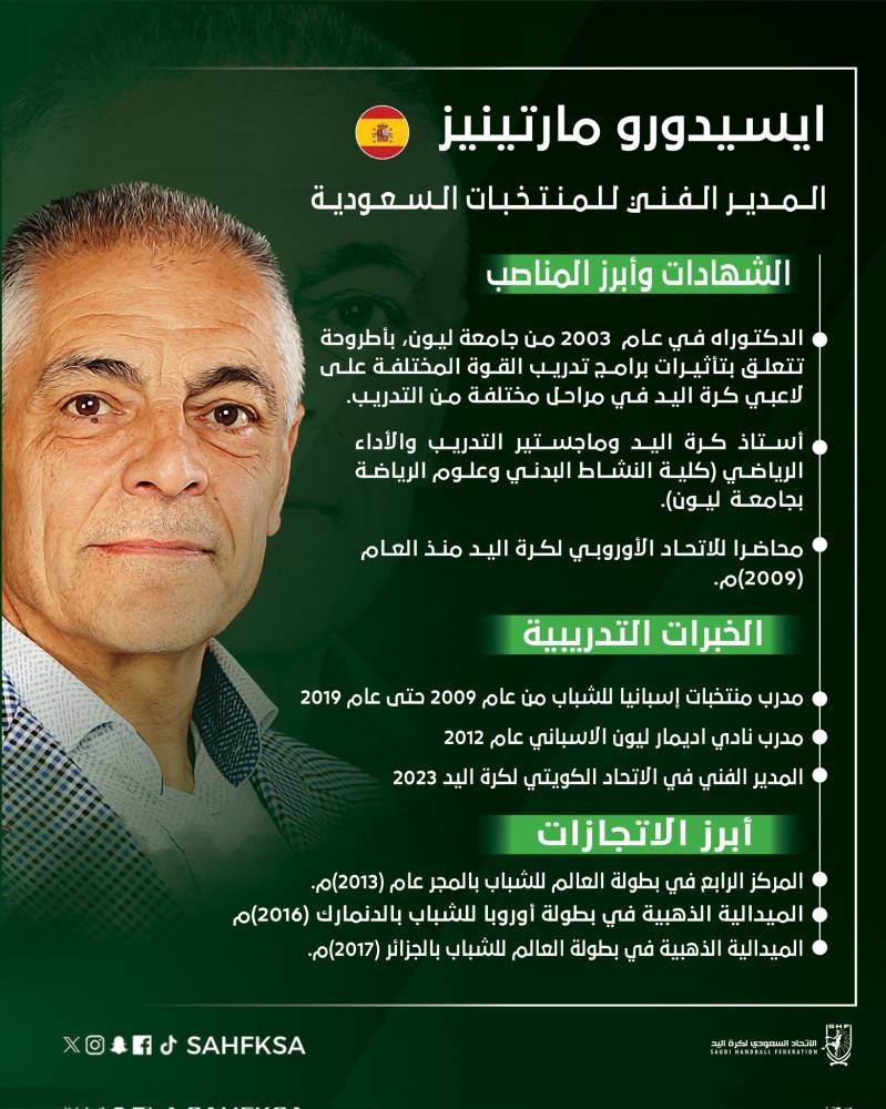 أعلن الاتحاد السعودي لكرة اليد عن تعيين الإسباني إيسيدورو مارتينيز مديراً فنياً للمنتخبات السعودية، في خطوة تهدف