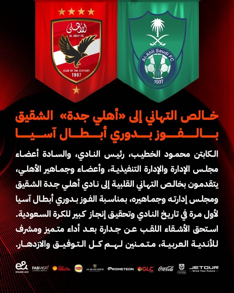 في لفتة رياضية أنيقة تعكس روح الوحدة العربية، أرسل الناديان المصريان الأهلي والزمالك تهنئة حارة للنادي الأهلي السعودي، بعد تتويجه بلقب دوري أبطال آسيا للنخبة 2024-2025، في إنجاز تاريخي للكرة العربية والسعودية، بعد فوزه على كاواساكي فرونتال الياباني بنتيجة 2-0 في المباراة النهائية التي أُقيمت (السبت) على ملعب «الإنماء» بمدينة الملك عبدالله الرياضية بجدة.