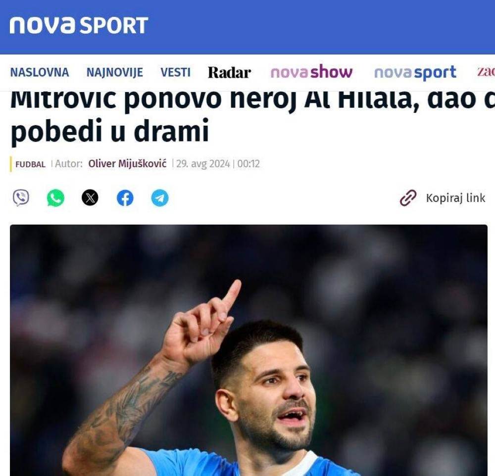 بعد أن قاد مهاجم الهلال الصربي ألكسندر ميتروفيتش فريقه للفوز وتجاوز فريق ضمك بعد أن كانت المباراة تتجه نحو التعادل الإيجابي 2-2 ضمن الجولة الثانية من دوري روشن للمحترفين، استطاع الهداف ميتروفيتش أن يسجل الهدف الثالث بطريقة رائعة بـ(الكعب) عند الدقيقة 84 ليمنح فريقه النقاط الثلاث، ويواصل فريقه صدارة الدوري. وبعد نهاية المباراة، حظي اللاعب «ميترو» بإشادة كبيرة من المواقع والصحف الصربية، وكتبت صحيفة (sportal.blic): «الميترو لا يتوقف عن تسجيل الأهداف، حيث منح فريقه الهلال النقاط الثلاث بتسجيله هدفين في مباراة كانت تتجه للتعادل. ورغم صعوبة اللقاء إلا أنه استطاع إسعاد جماهير فريقه»، وأضافت: «بعد هذين الهدفين أصبح اللاعب في صدارة هدافي الدوري برصيد 4 أهداف بعد جولتين حتى الآن». وأشاد موقع «direktno» باللاعب على قدرته التهديفية، وتحديداً الهدف الثالث للهلال الذي من خلاله حقق النقاط الثلاث، حيث أشاد الموقع بأن هذا الهدف فيه ذكاء وبراعة من اللاعب كونه سجل الهدف بكعب القدم. وكتبت صحيفة «nova»: «ميتروفيتش يواصل التألق مع الهلال، وذلك بفضل الثنائية التي سجلها في مرمى ضمك رغم قوة وتميز حارس فريق ضمك».
