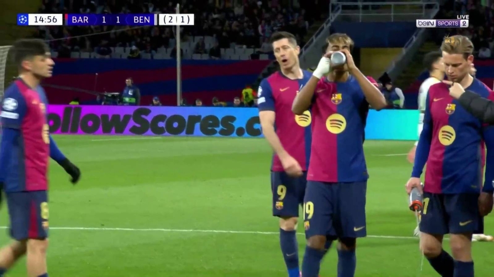 وفي الدقيقة 14 توقفت مباراة برشلونة وبنفيكا الأخيرة، وظهر «لامين يامال» وهو يتوجه لخطوط التماس من أجل كسر صيامه وشرب المياه.