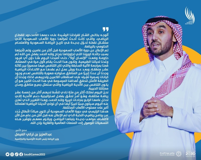 وأضاف سموه: «تم الإعلان عن دورة الألعاب السعودية قبل أكثر من عامين، وتم تأجيلها بسبب جائحة كورونا التي تجاوزناها بنجاح ولله الحمد بفضلٍ من الله ثم حكومة وضعت «الإنسان أولًا»، حتى أصبحنا اليوم هُنا دون أي قيود وعُدنا لحياتنا الطبيعية. ولكون هذا الحدث يقام لأول مرة في المملكة، قمنا بمراجعة الآلية السابقة التي كان التنافس فيها محصوراً بين 13 منطقة، وبعد ورش عمل عدة تم عقدها مع الاتحادات الرياضية وجدنا أن عدداً كبيراً من المناطق ستواجه صعوبة بالتنافس لعدم وجود كيانات رسمية تُشرف على استقطاب اللاعبين وتدريبهم؛ لذلك وجَدنا أن الطريقة الأمثل لنُحقق أهدافنا المرسومة في هذا الحدث الكبير هو أن يكون التنافس بين الأندية الرياضية التي ستمثل جميع مناطق ومدُن مملكتنا الحبيبة». وأضاف يقول: «نحن اليوم نمتلك أكثر من 100 نادٍ تنشط لديهم أكثر من 15 رياضة مختلفة، وهو أمرٌ تحقّق بفضل استراتيجية دعم الأندية التي تدخل عامها الرابع بنجاحات كبيرة ولله الحمد، وهذا التغيير الذي نُعلِن عنه اليوم سيكون سبباً كبيراً أيضاً في أن تولي أنديتنا الرياضية اهتماماً أكبر على مستوى الألعاب المختلفة، هدفنا الرئيسي في دورة الألعاب السعودية أن تكون ميلاداً لأبطالٍ جُدَد عبر برنامج رياضيي النخبة الذي تم الإعلان عنه قبل أقل من عامٍ من الآن لاكتشاف مواهب جديدة يتبناها البرنامج، ويلتزم معهم بتوفير هذه التسهيلات للوصول إلى المنصات العالمية والقارية بإذن الله».